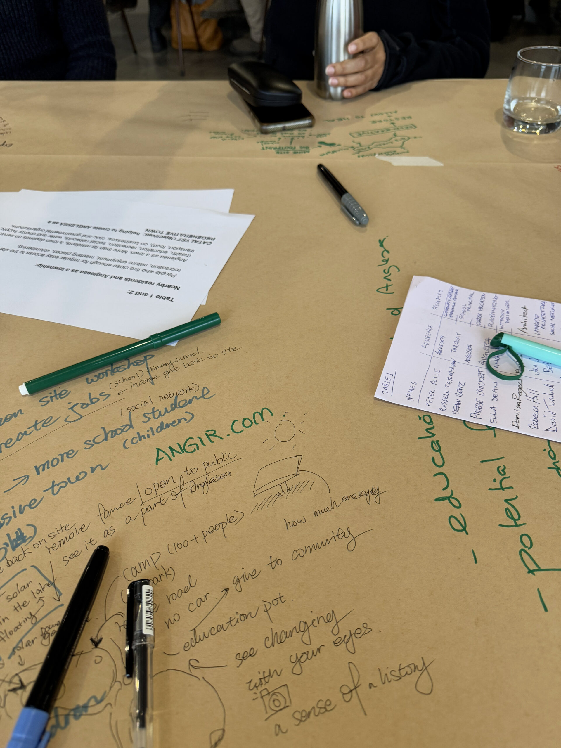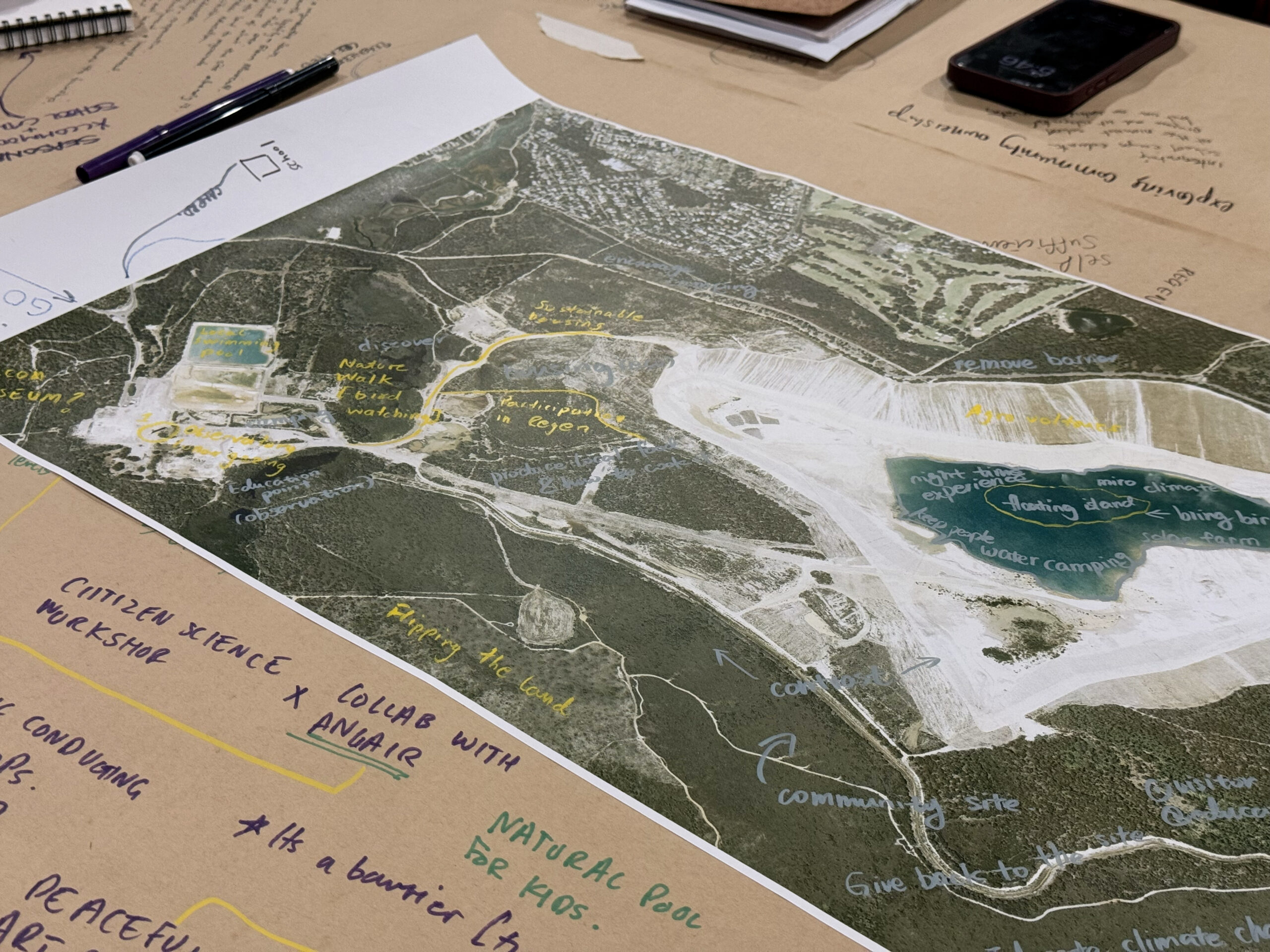 在后半段讨论中,焦点转向旧矿区场地本身。参与者围绕 A2 尺寸的场地图,讨论不同区域可能承载的功能与活动,包括自然系统如何支持使用、路径与连接如何形成。